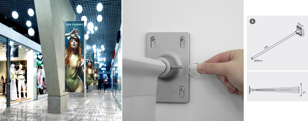 Aluminium muurhouder die men kan bijstellen voor de positie van de uithouder bij oneffenheden in de muur. Bijstelling is enkele graden. Eenvoudig bevestiging van de uithouder. Wordt geleverd met print op 110 gr. glanspolyester vlaggen in de afmetingen van 60 cm breed en 200 cm hoog. Overige afmetingen zijn op aanvraag. Natuurlijk is deze ook zeer geschikt voor toepassing in bijvoorbeeld winkelcentra. Voor de print een kant-en-klaar drukbestand aanleveren conform netto afmeting van de banner.