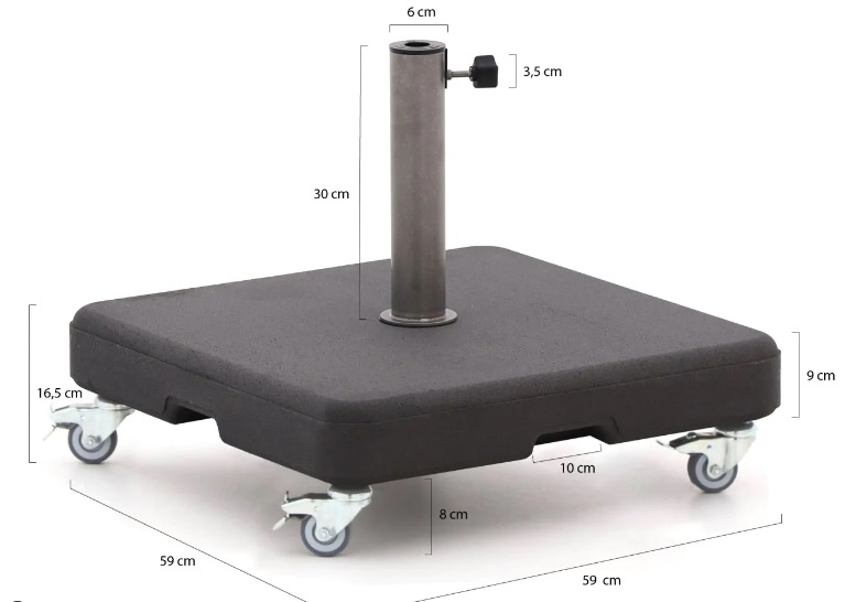Code ANTRACIET4760verrijdbaar; zie afbeelding. Antraciet kleurige betonvoet van 60 kg. Gechikt voor mastdikte van 25 tot 55 mm.